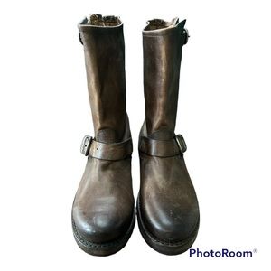 The Veronica biker boots are made from vintage leather that's been washed and oiled, as well as hand antiqued and polished, giving the pair a two-tone, worn inish. Size 7