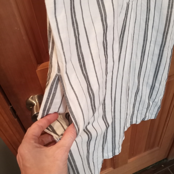 This stylish Liz Claiborne dress in size S features a striped pattern in black and white. The dress is made of a comfortable linen and cotton blend material, perfect for a casual or semi-formal occasion. Its midi length adds a touch of elegance to the overall style. The dress is designed for plus size women and comes with a flattering cut that accentuates the wearer's figure. The dress's style is versatile and perfect for any fashion-forward woman who wants to stand out from the crowd. See pic of imperfection on backside.