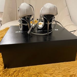 ALEXANDER WANG STILETTO KILEY CALF STRAPPY SANDAL 37.5 white. Worn once. Small scuff at the front of the shoe as shown in pic. Comes with box. Great condition. Buffed calfskin sandals. Open round toe. Hardware stiletto heel. Adjustable pin-buckle straps at vamp and ankle. Silver-tone hardware. Tonal snitching. Approximately 3.5 heel.