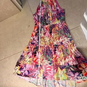A vibrant tropical floral print is the feature of this sleeveless high-low dress with tiered skirt and shirred detailing