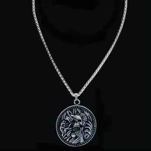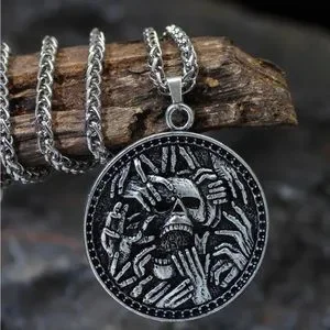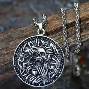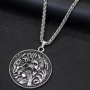 “Undead” Skull Skeleton Zombie Hands Creepy Spooky Halloween Silver Coin/Medallion/Circular Gothic Punk Rock Stainless Steel Necklace on thick rope chain. Nice weight to it. Unisex - men or women. Great for Halloween or year-round wear. New.