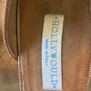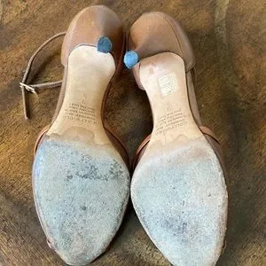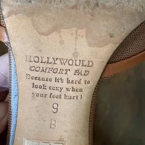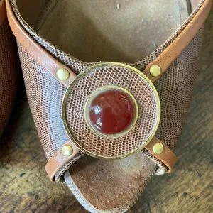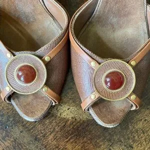 Hollywould high heel shoes in a medium brown “pebbled” leather feature a brown disk with a faux jewel center.