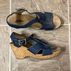 Clarks wedges with a jean stitching on denim fabric. Cork-like wrapped wedge and gold buckle closure. Slight platform. Two small imperfections- slight scratch on one wedge and slight peeling at inner arch. Could easily be fixed with glue.