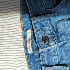 Womens high rise women's Levi's Jeans. Size 26. Distressed front, see some pink discoloration on threads of front tear.