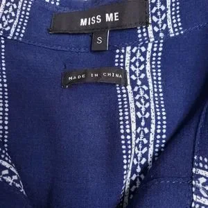 Miss Me, navy blue and white patterned vertical stripes, collared, button front neckline, extra button attached to tag, caged cutout detail at collarbone, lightweight and flowy, perfect casual dress for the warm weather, in excellent condition with no known flaws.
