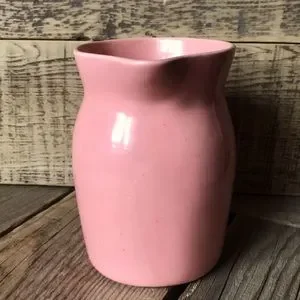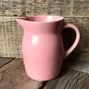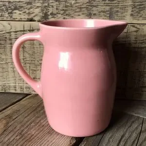 Vintage, likely 1940s, ceramic pottery pitcher. Holds 1 quart of liquid, which reaches the indentation just below the spout. Coral pink color, which has a slightly more peachy hue than the pictures show. Marked with a small "H" on the bottom. Glaze has faint crazing throughout, which is very tough to see unless really looking close up, as well as a few small pits and offset marks on the bottom where the pitcher sat during firing. Please check out all pics. Great vintage condition otherwise!