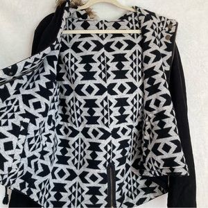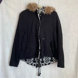 Beautiful Reversible jacket with black and tribal print pattern. Hooded and has pockets on both sides. From the brand BBDakota, Size L.