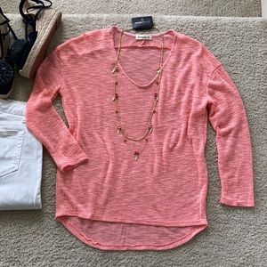Peach Color Long Sleeve Top. Gorgeous and lightweight. Easy to throw on and go. Drop shoulder. Long sleeves. Slightly sheer. Hi lo styling. 74 polyester 26 rayon. I am modeling size Small. Fit is true to size. New boutique item. Made in USA.
