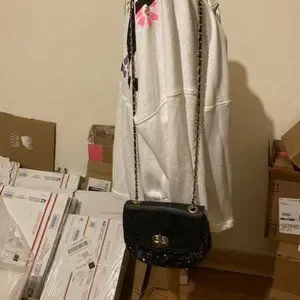 Chico's crossbody evening bag in black and gold sequins. It has a zipper pocket inside. It is 9" x 9" x3". I only used this once., The strap is about 47 1/2 inches long