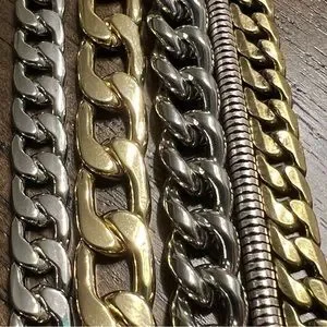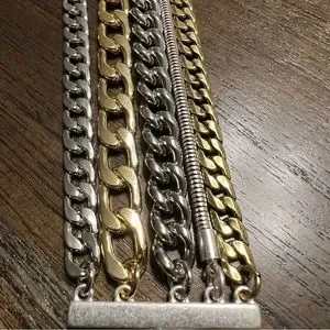 A mix of classic and modern chains, this cuff is for someone who loves a good stack. Well made, mix of iron, zinc and brass, with silver, gold and rhodium toned plating finish: high polish / antique wearable length: 7"-8.5" width: 1.5" / 3.8cm weight: 2.36oz / 67g