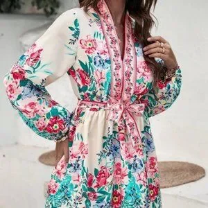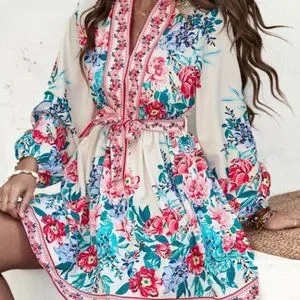 Floral Print with Lantern Sleeve Belted mini Dress