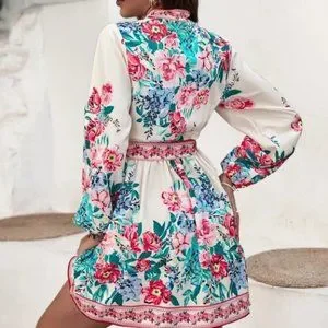 Floral pattern Lantern Sleeve Belted mini Dress