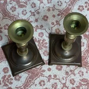 Two vintage brass candle holders featuring a circular top and footed square base