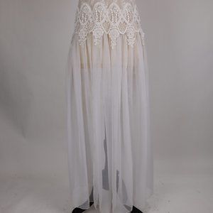 Material: Polyester/nylon. Two slits in the front skirt area. Buttons in back.