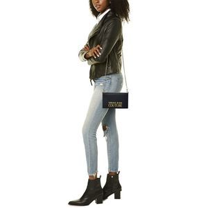 About the brand: Versace luxury with a contemporary, youthful edge. Wallet On Chain in black faux leather and gold-tone hardware with logo lettering and exterior pocket Interior design details: printed fabric lining, zippered pocket, card slots Measures 7.75in wide x 4.75in high x 1.25in deep Removable shoulder strap drops 22in Fold-over flap with magnetic closure Please note: All measurements were taken by hand and are approximate; slight variations may occur. Our products are 100% genuine. In some cases we purchase merchandise from trusted independent suppliers and not directly from the brand owner. In all cases we stand by the authenticity of every product sold on our site.