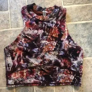 Tight fit: Tight fit, cropped length Great condition. I have only worn couple times. I love the flattering high neck and the built-in bra support but unfortunately it was just a little too much side boob for me. I am a 34D with wide set girls so this is a common problem for me and probably would not be for most people.