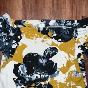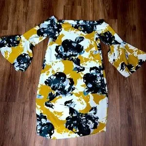 Worn once Olivia Matthews dress with bell sleeves and beautiful neckline. Floral pattern . Stretchy material