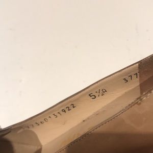 Size 5.5 narrow. Heel is 2.5” tall. Minor repair on back right heel (pictured), and small nicks on back left heel (also pictured)