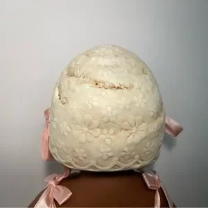 She has brown molded hair and a cream colored antiqued white molded hat that is NOT removable.
