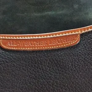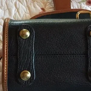 Classic handbag with black pebble leather trimmed in tan leather. Measures 9.5 inches wide, 8.5 tall, 4.5 inches deep with an adjustable shoulder strap up to a 19 inch drop. The bag has an outside pocket and 3 inside pockets. Bag is like new.