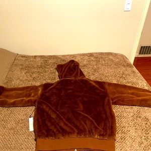 Forever 21 X Pantone Teddy Bear Jacket Brown Size M Brand New plush zip-up jacket featuring a hooded construction, dropped long sleeves, high-polish front pull-ring zipper, front "Pantone" patch, and front slant pockets.