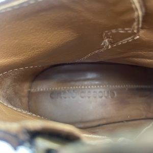 Chestnut color suede with brown leather strap and buckle detail. Side zip. Leather lining. Crepe wedge sole. EUC. Size 38