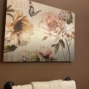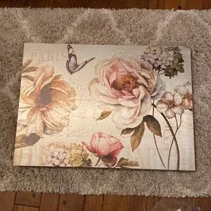 This beautiful picture matches my shower curtain perfectly. I only used this for about a week. I wanted a larger picture. I found a larger picture just like it on canvas. The metal was too expensive in the size I wanted. The hardware for hanging this picture is on back in like new condition. The art is 10”x 17”. It is very light weight. This is a gorgeous picture. With it being on metal it looks like different colors at different angles. If interested I have the new shower curtain and towels listed for sale. Feel free to ask me any questions. A good thing with this art no glass to clean!!!! There is wood attached to the metal on the back for hardware to be attached.