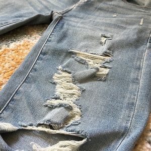 Color: light wash, distressed/rips, raw hem bottom