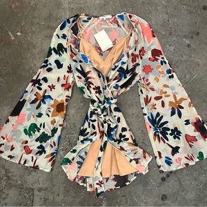 Copper-colored cami with a semi-sheer cover up. The flowers on the cover up are velvet. It’s technically a velvet burnout fabric. Measurements included in the pictures.
