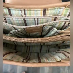 Midsize - big enough to tote more than just wallet & lipstick. Leather flap w/magnetic closure, 2 zippered pockets inside and 2 cell/quick access compartments.