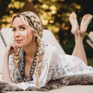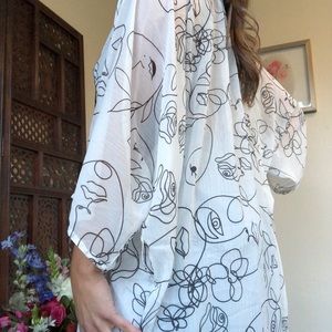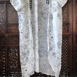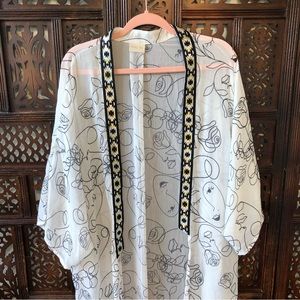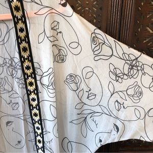 Gorgeous longline kimono/ bathing suit coverup with illustrated line drawings of women’s faces and abstract floral swirl designs. Front is framed with a mixed metallic geometric trim. Please be sure to view the video to see the length!