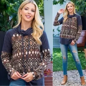 Detail - soft comfortable fabric, slouchy turtleneck, drawstrings, Aztec print with solid contrast, casual fit, slightly rounded hemline
