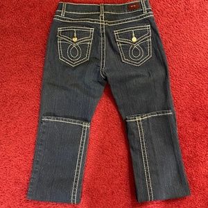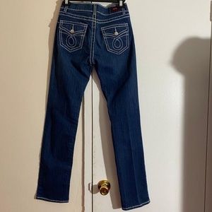 Pre-own in excellent condition U-51 Straight Leg embroidered jeans with distressed on the front leg
