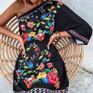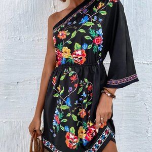 Shabby Chic Floral One Shoulder Mini Dress Black