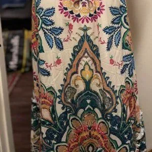 This Medium sized High-Low print dress features a cinched waist, V neckline, back neck tie along with a plunging front and back