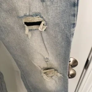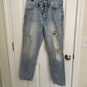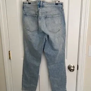 Old Navy jeans faded light blue, worn once, button fly, high waisted, size 12, straight leg, regular length, a few holes in front none in back