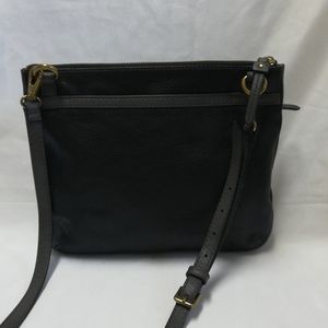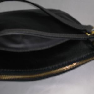 adjustable strap. front one zip pocket, back open pocket. zipper closure.