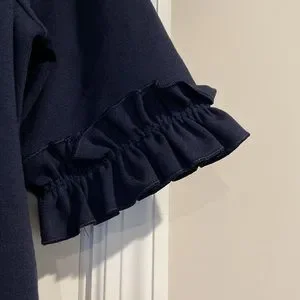 Ruffle trim sleeves. There’s a faint residue from the size tag but I’m sure that’d wash off.