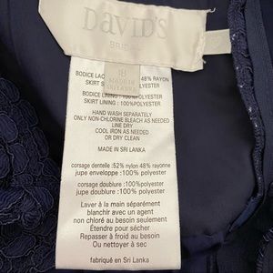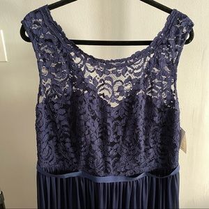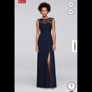 This long bridesmaid dress features a lace bodice, an illusion neckline, a ribbon-defined waist, and a fluid mesh skirt with a slit. Fully lined with a back zipper closure.
