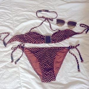 Size 4 super cute zig zag bikini it’s a rusty brown color with black chevron pattern embellished with gold and black I bought it and it was just a little too small for me👙😎
