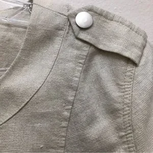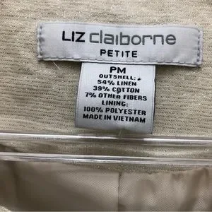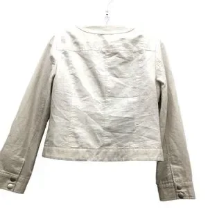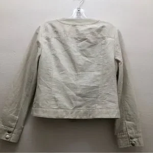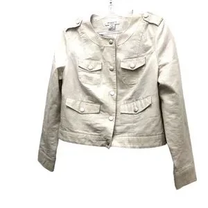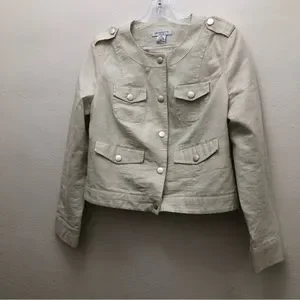Women's Size PM Liz Claiborne Cream/Silver Scoop Neck Short Jacket. Long Sleeve with two snap closure. Fully lined jacket with four front pockets and two shoulder straps. Snap down design. Washable or Dry Clean.