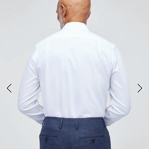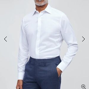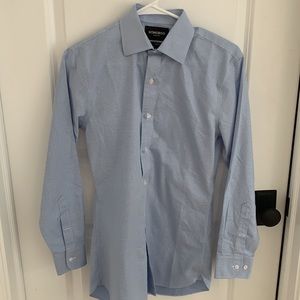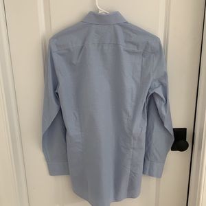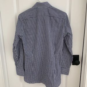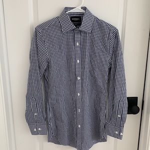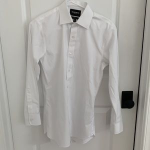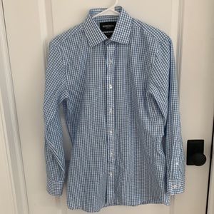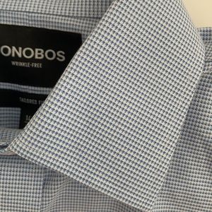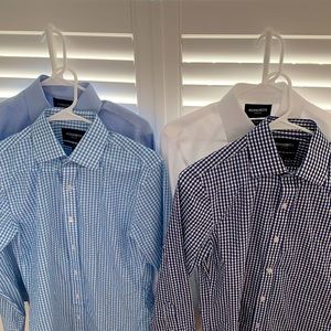 LIKE NEW!! Set of four Bonobos "Daily Grind wrinkle Free" dress shirts. All size 14.4 neck/ sleeve 32/ tailored fit/ semi-spread collar (with collar stays). Colors are white, blue gingham, blue white plaid, and blue texture. These shirts are gorgeous and in like new condition- none of them were worn more than a few times. Truly beautiful classic shirts.