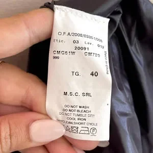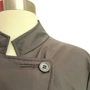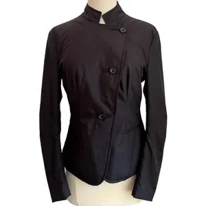 Beautiful asymmetric close jacket from Armani Collezioni. Crafted from a water resistant poly designed for outerwear. Edgy diagonal close, mandarin style neckline. Great with suiting or jeans.