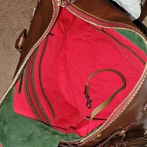 Main entry zip closure, double handles, tassels, front and back buckles, back slip pocket, leather patch logo, four feetLined interior, two front-wall slip pockets, back-wall zip pocket and slip pocket, key hookMeasures approximately 10"L x 14"W x 6"D with an 8" handle drop; weighs 2 lbs, 7 ozBody/trim 100% leather; lining 100% cottonImported