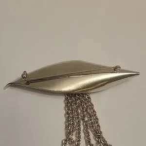 Silver-tone leaf shaped pin with a ball in the center with 5 danging chains with balls.