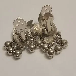 Straight back with foldover clasp. Measures 2 7/8" long x 5/8" wide. Matching earrings are 2 silver-tone leaves with 6 chains and balls. Clip-on backs. Measure 1 5/8" long. Very good condition. Purchased in 1960s.