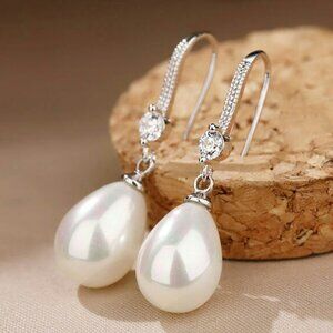 "925 Silver Plated Tear Drop Pearl Wedding Earrings, FB16FA1074