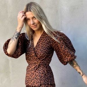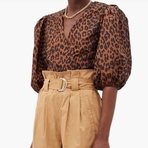 NWOT Ganni Leopard Print Balloon Sleeve Wrap Top, Size 34