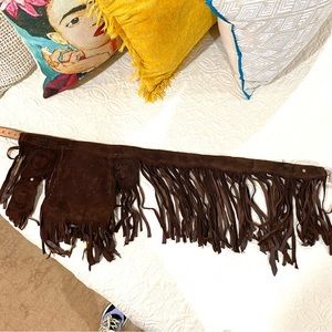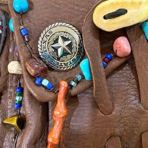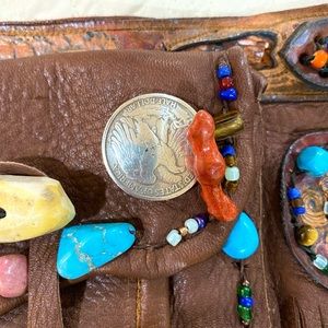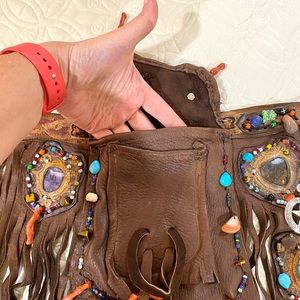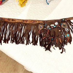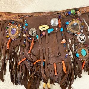 This is wearable art and a show stopper as well as one of a kind. I’ve owned this beautiful belt for over 10 years and have only worn it a few times. It’s all hand made by a medicine man from a tribe in the western US. It is covered in various types of stones, beads, red coral, turquoise, etc. on a rich soft chocolate brown leather attached to a belt with snake skin inlays. It’s got two pockets as shown. It’s 44.5 inches from tip to tip and about 13 inches at the longest point. I’ve included a picture showing how it’s worn, lower on the hips, it does not go into belt loops, made to go over clothes. At it’s smallest it will fit 32”. Only signs of wear are some minimal scratches on the buckle but they definitely don’t detract from the overall beauty of the piece. Included in the pictures is the receipt showing what I paid for it. A true statement piece!!