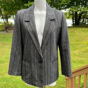 This terrific wool/poly/acrylic blazer is truly special. The print is classic and stands the test of time. Goes great with black pants or skirts, both of which I have in my closet, also. Deep front pockets and nylon lined, this jacket will keep you warm and looking stunning all fall and winter.